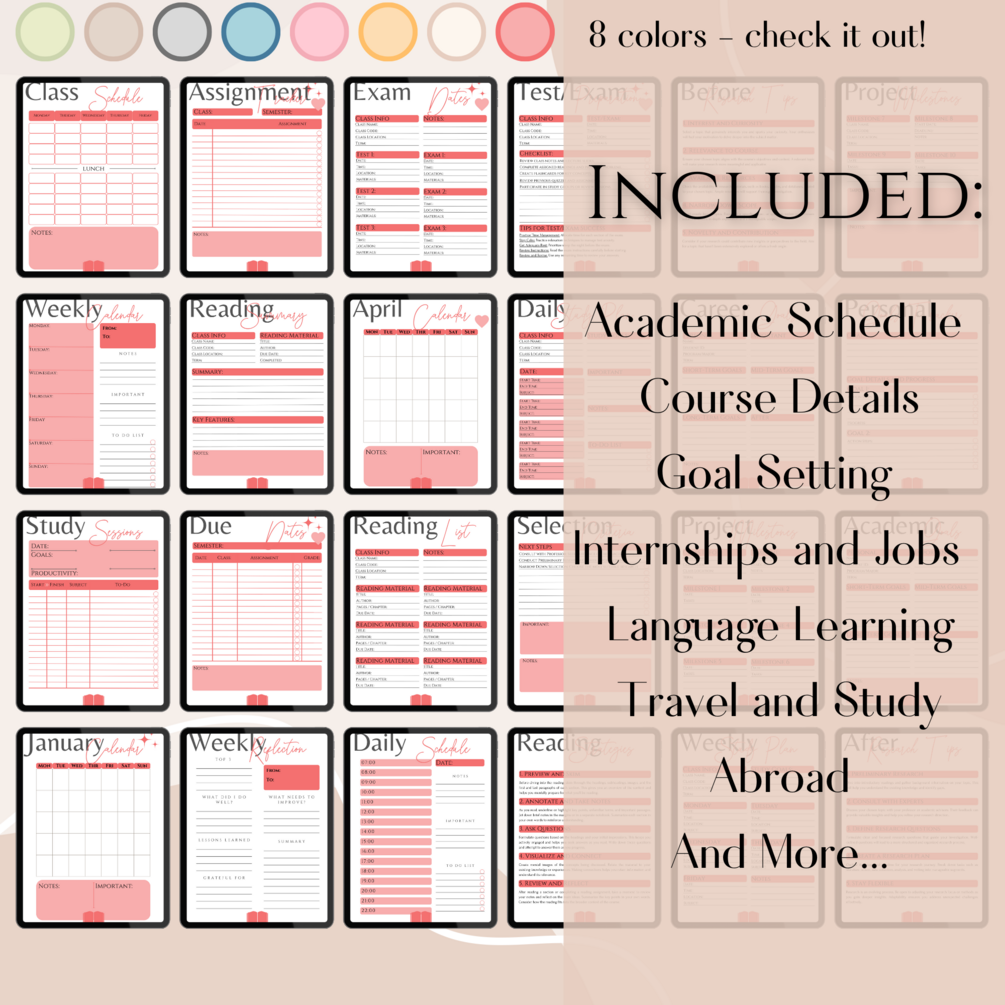 Uncover the Essential Red Digital Student Planner – Your Ultimate Partner for Boosted Productivity and Streamlined Organization. Available in 4 different sizes and 7 different colors! This particular color might not resonate with you? Take a look at my profile; this planner is also accessible in other colors that might be more to your liking. Embrace Effortless Planning and Elevate Your Productivity Today. It includes: