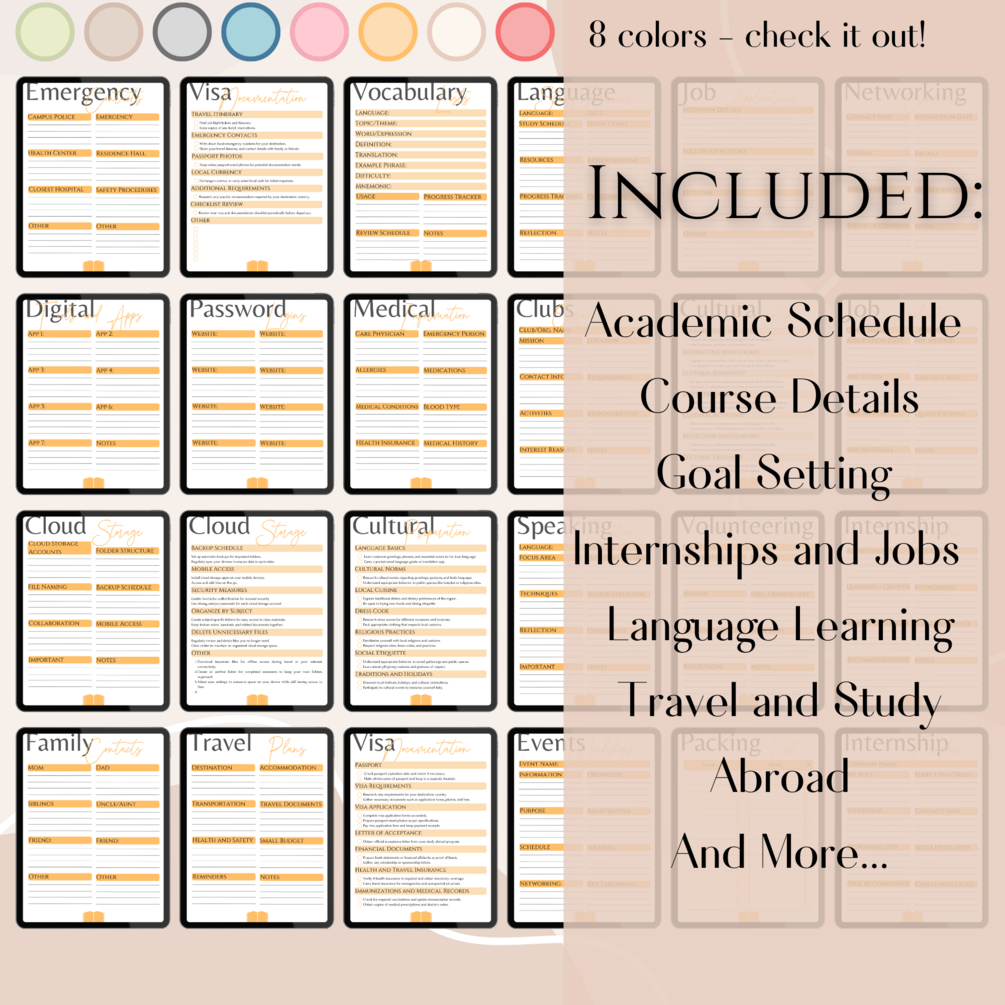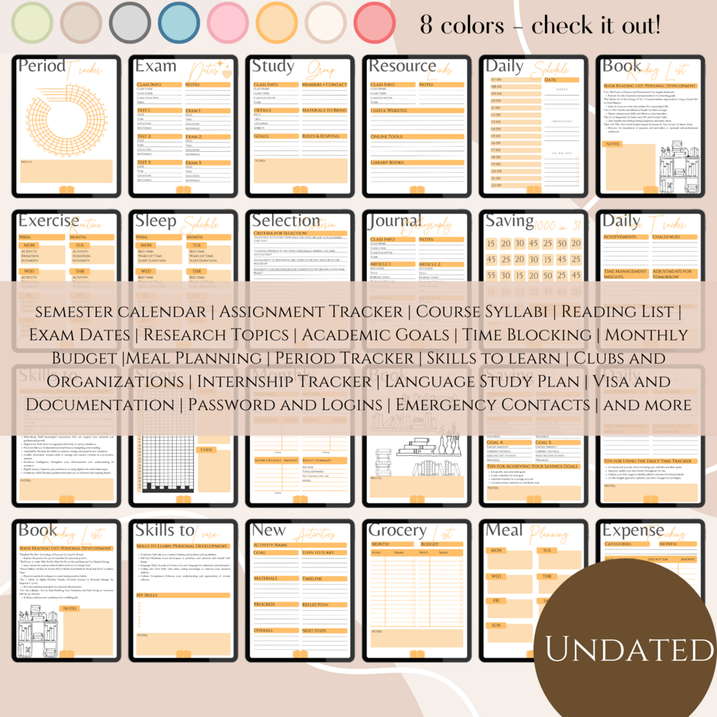 Discover our Orange Digital Student Planner – Your Ultimate Ally for Enhanced Productivity and Streamlined Organization. Available in 4 different sizes and 7 different colors! This particular color might not resonate with you? Take a look at my profile; this planner is also accessible in other colors that might be more to your liking. Embrace Effortless Planning and Elevate Your Productivity Today. It includes: