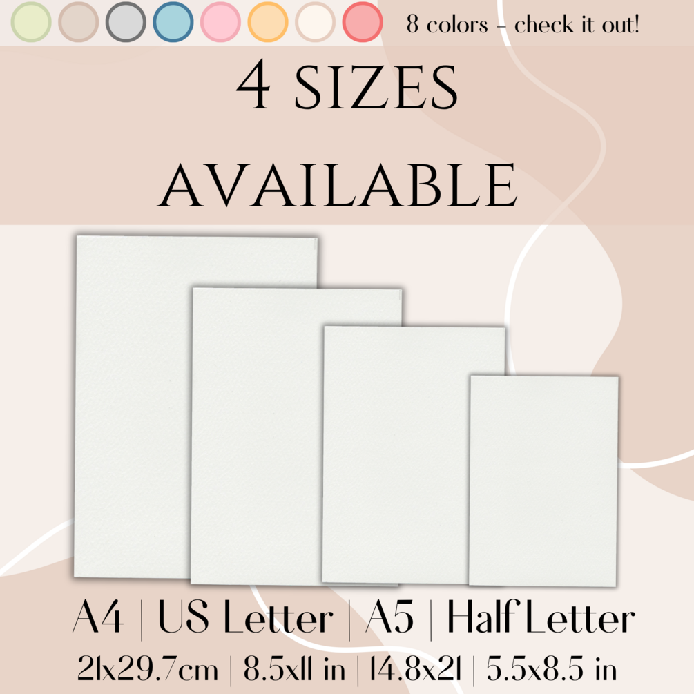 - What formats are available? There are 4 sizes available, A4 (21x29.7cm), A5 (14.8x21cm), Letter (8.5x11in) and Half-Letter (5.5x8.5in)