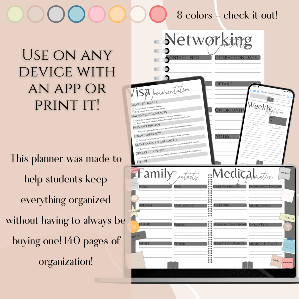 Discover our Grey Digital Student Planner – Your Ultimate Ally for Enhanced Productivity and Streamlined Organization. Available in 4 different sizes and 7 different colors! This particular color might not resonate with you? Take a look at my profile; this planner is also accessible in other colors that might be more to your liking. Embrace Effortless Planning and Elevate Your Productivity Today. It includes: